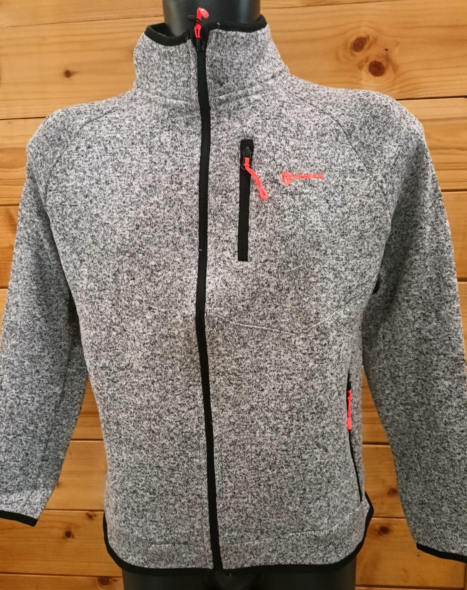 Pile uomo melangiato, zip intera con taschino sul petto. Fondo giacca, polsini e giro collo rifiniti con fettuccia elastica