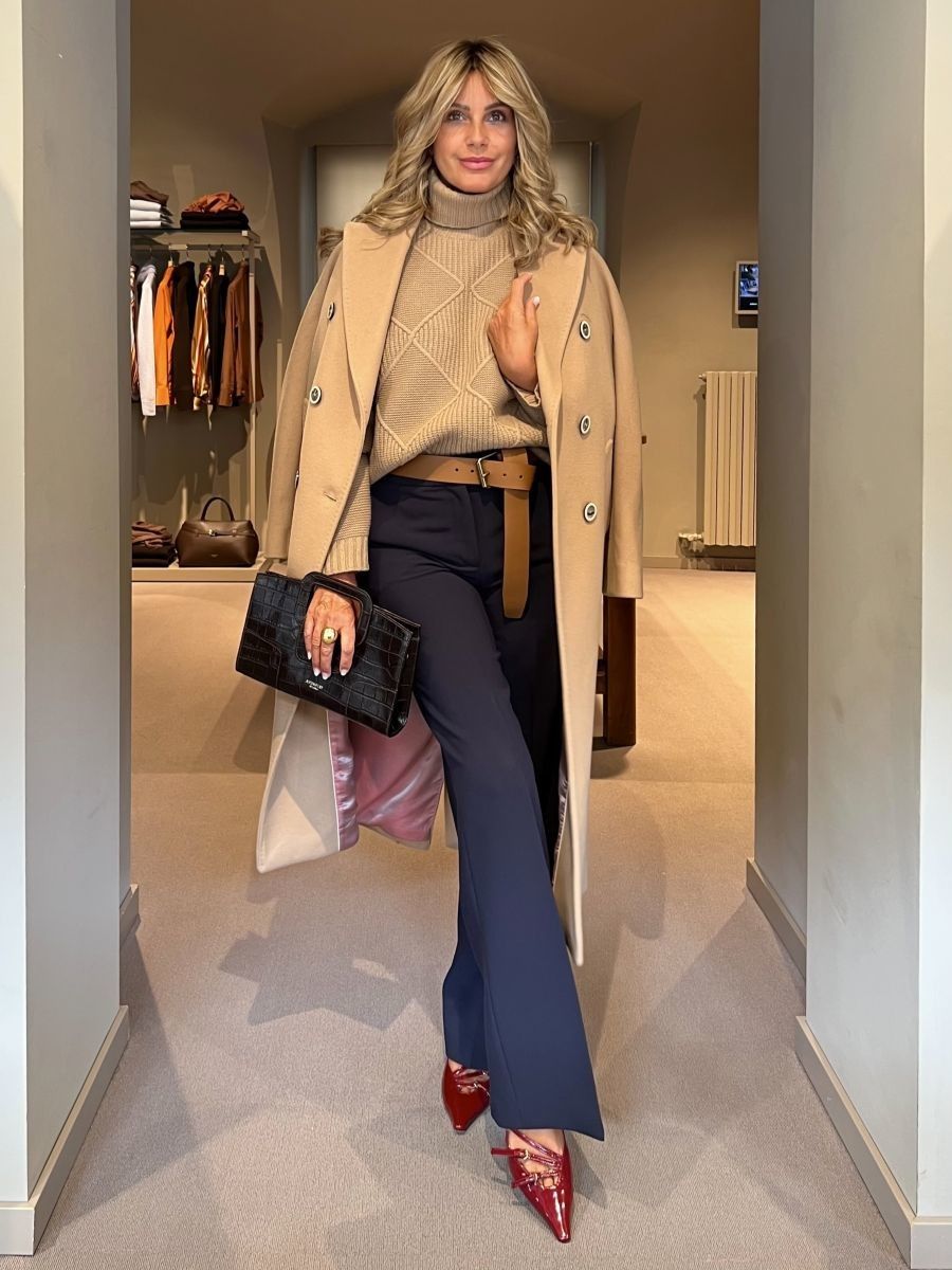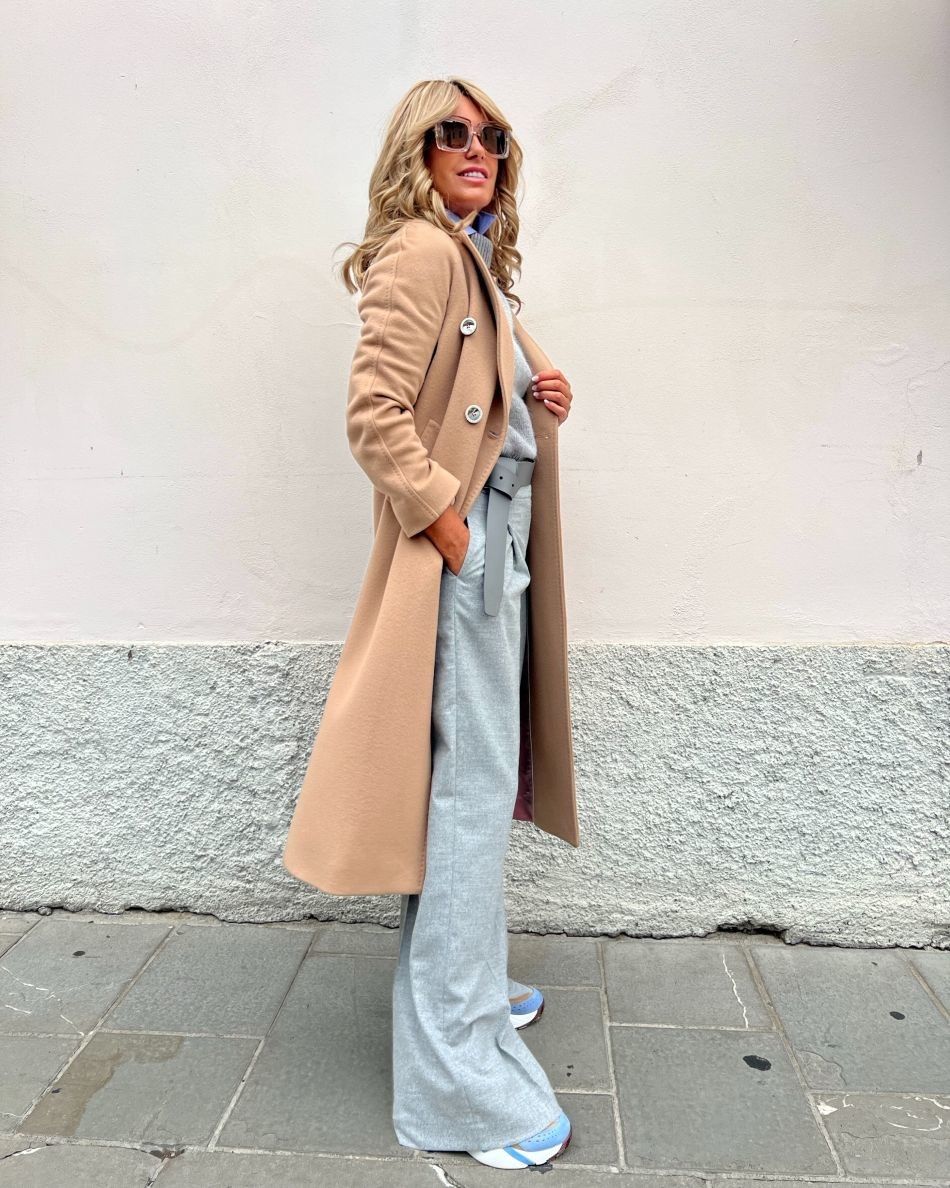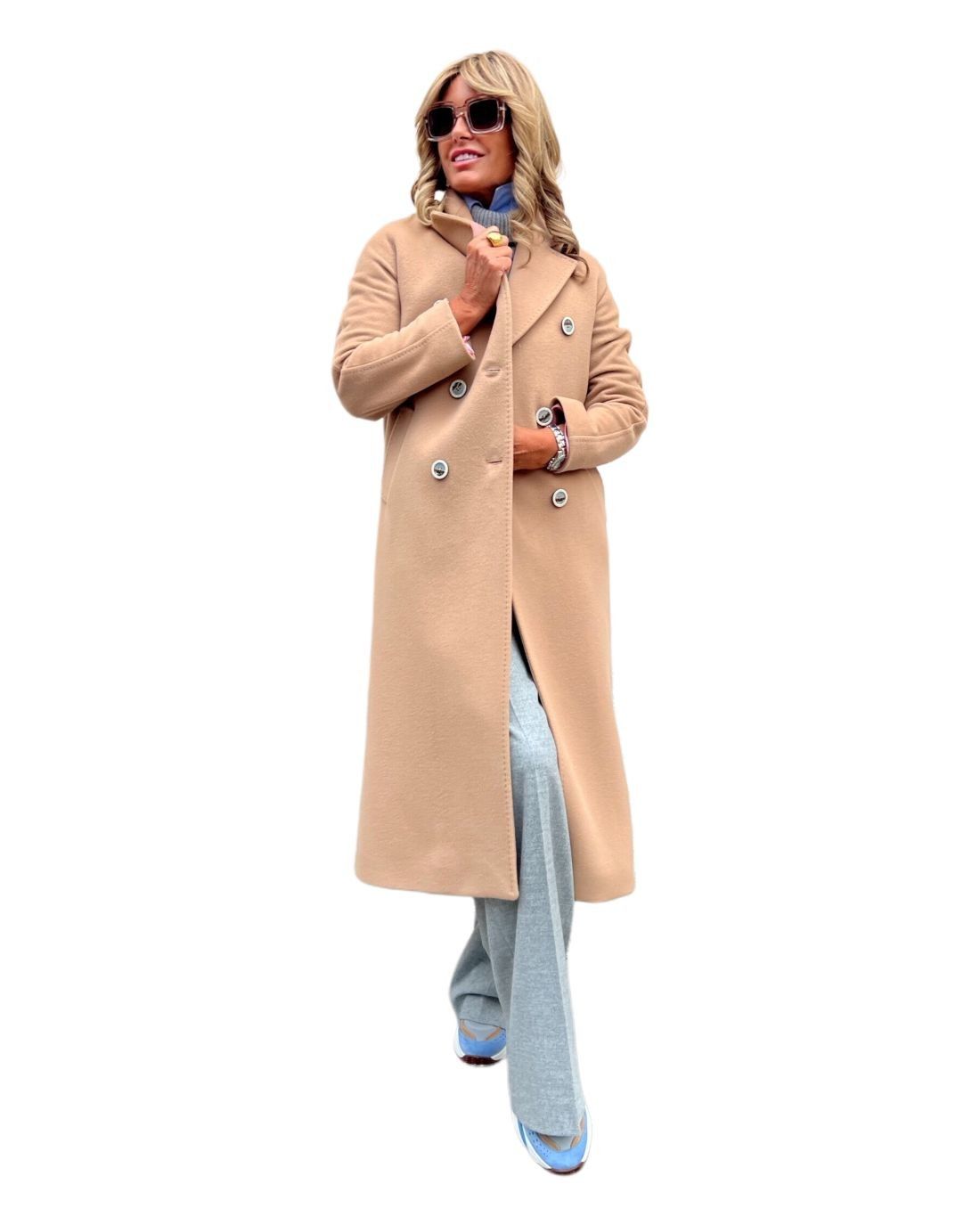 Cappotto Mirna Cammello CHIARULLI, doppiopetto, manica raglan, 90% lana 10% poliammide, spacco posteriore