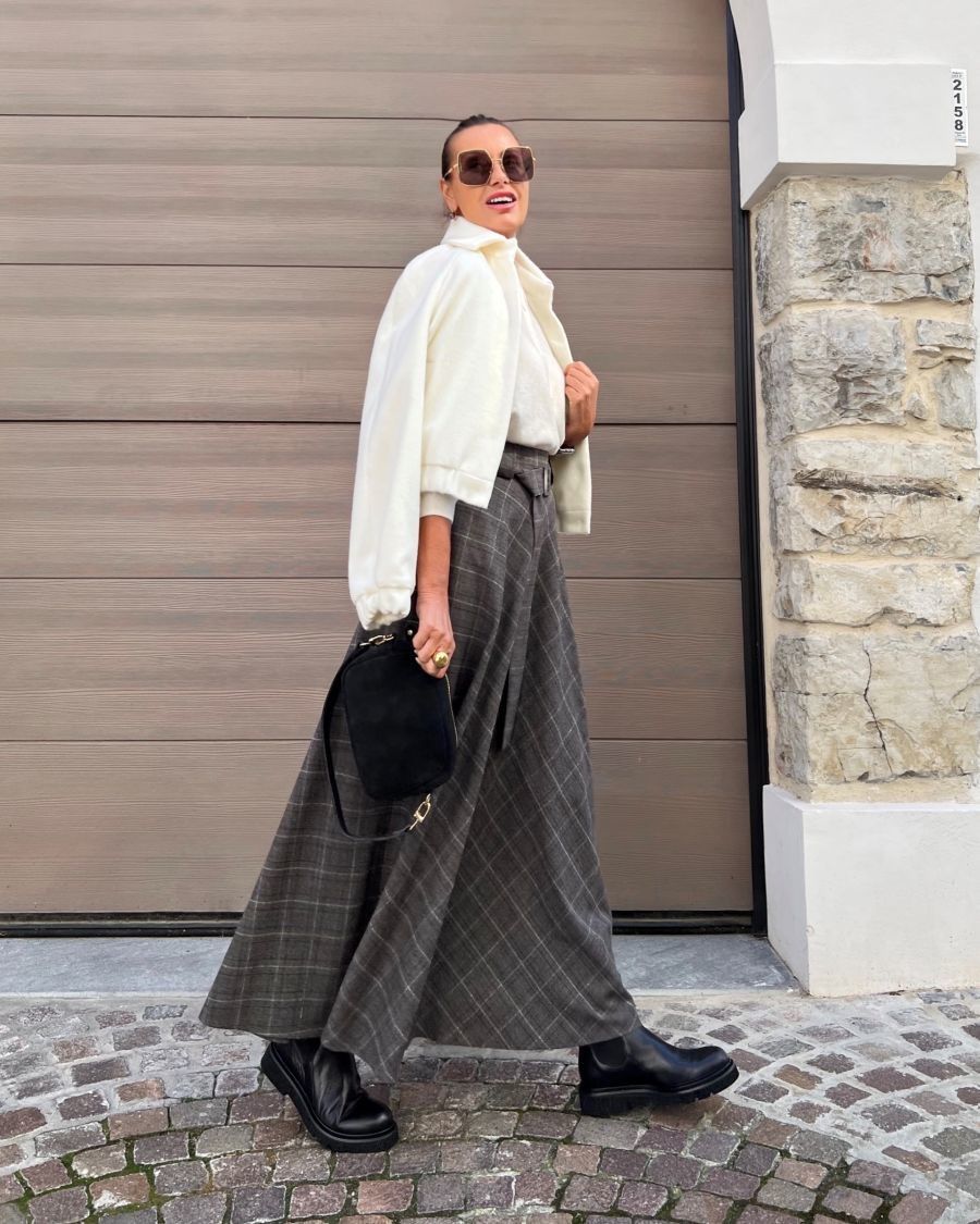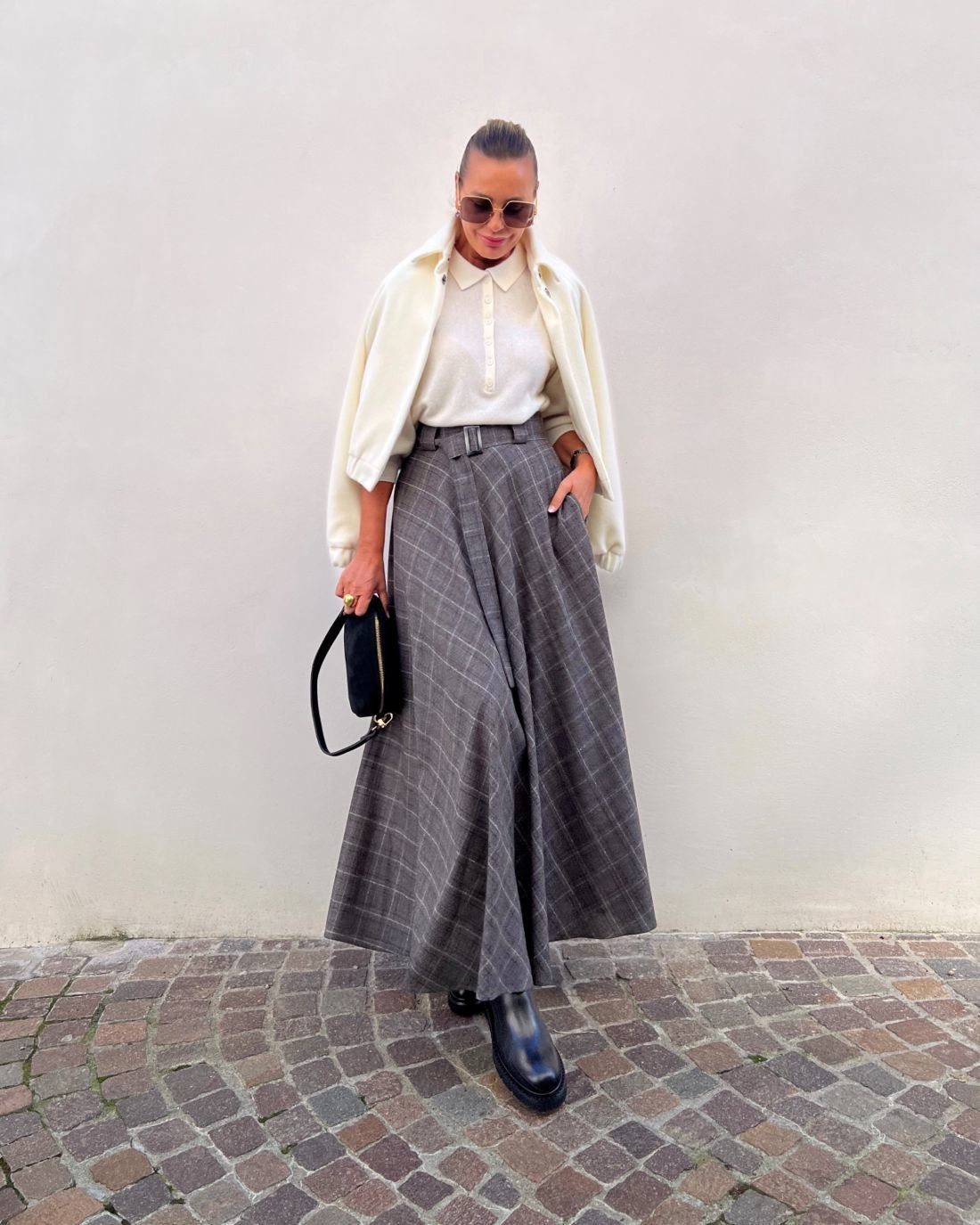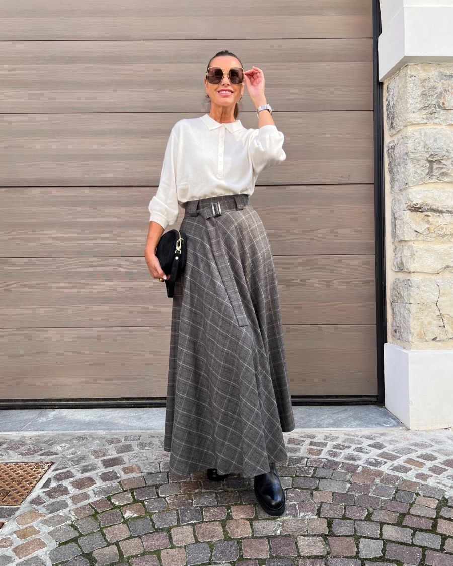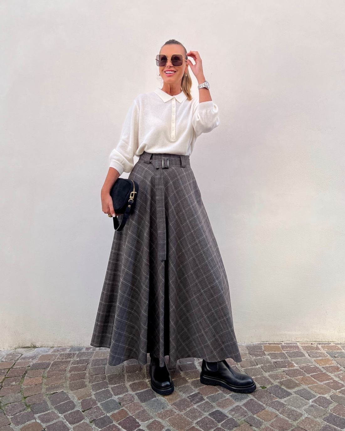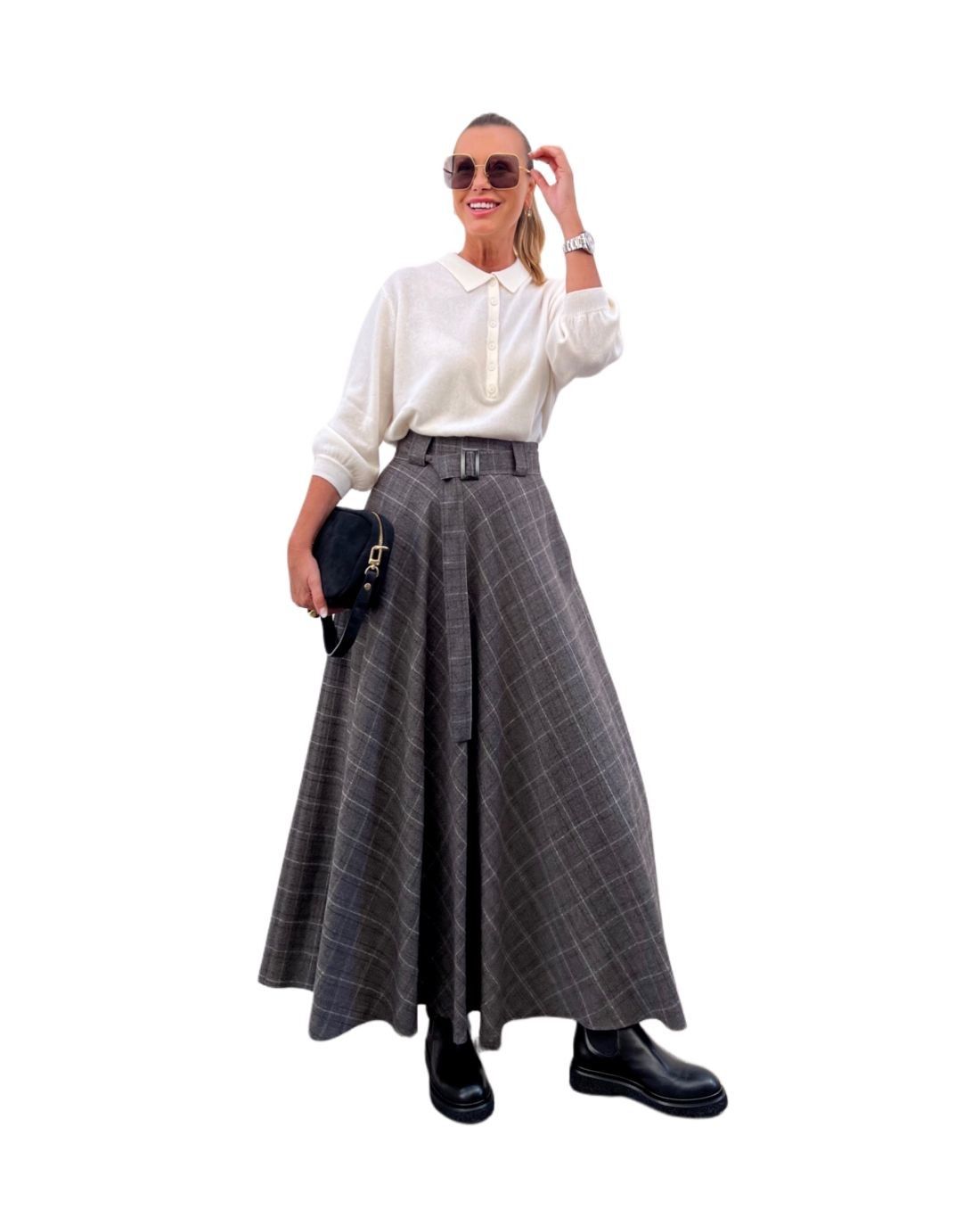 Gonna Leila Fantasia NG71, 100% lana, modello a ruota, zip laterale, passanti con cinturina incorporata