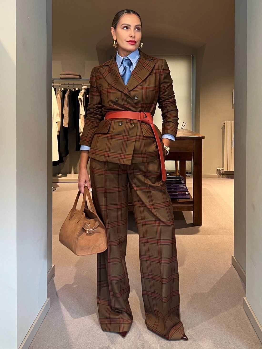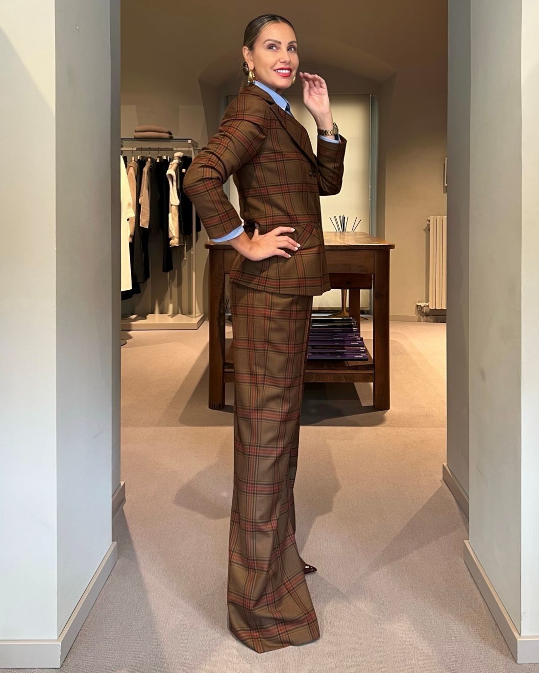 Pantalone Ivana Fantasia NG71, 100% lana, modello palazzo, doppia pinces piatta, zip e bottone, tasche, retro liscio (vedi Giacca Agata nella stessa fantasia per fare il completo)