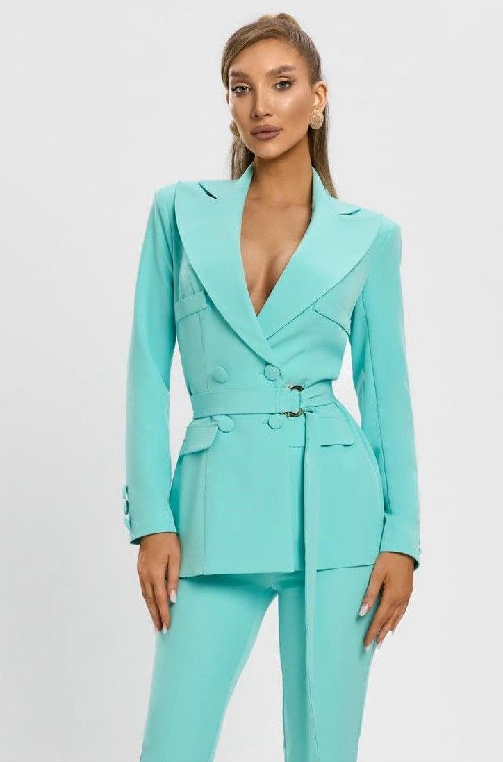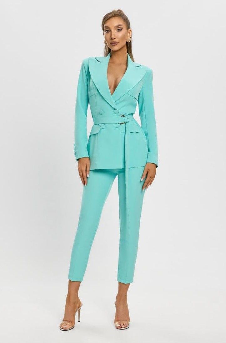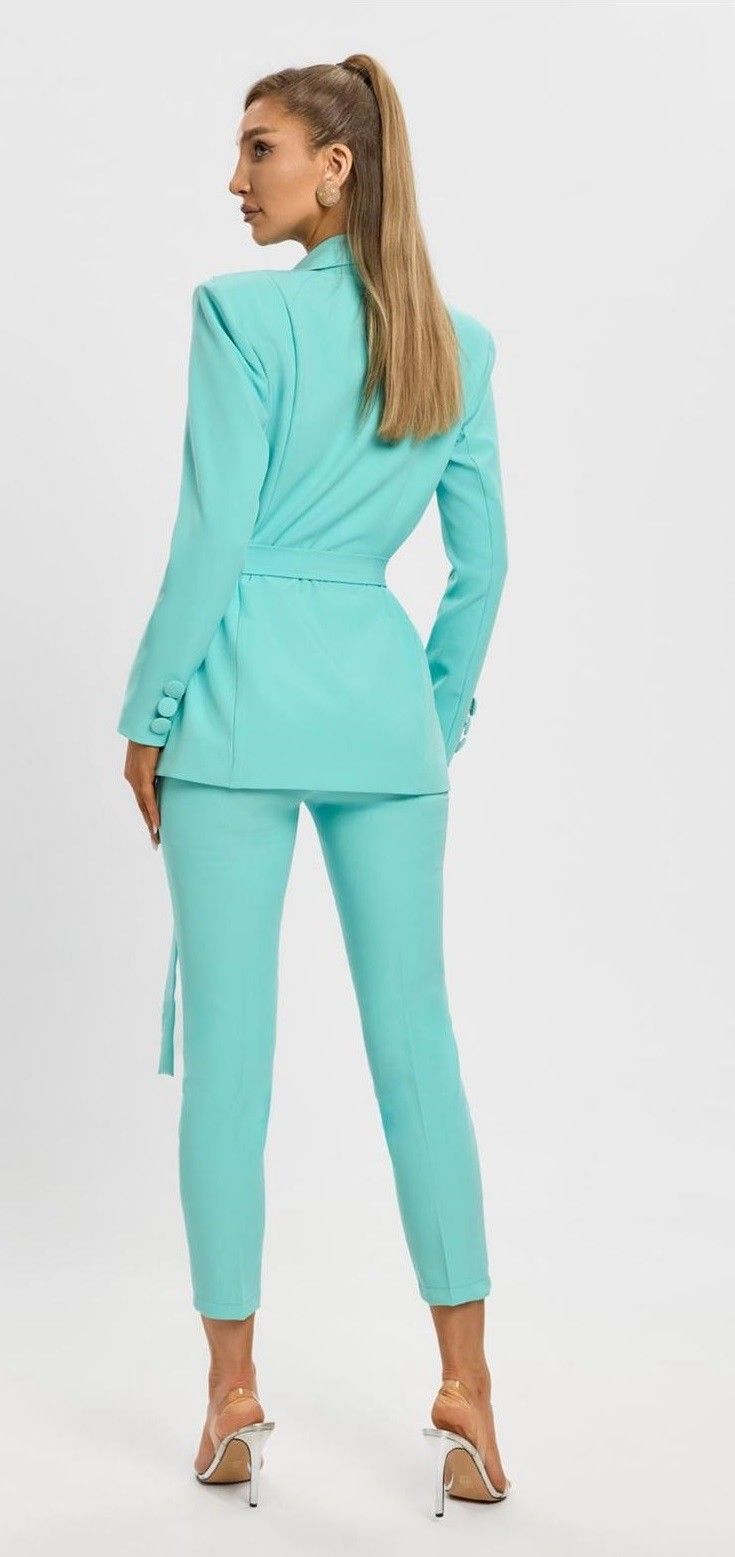 Raffinato e moderno,questo tailleur turchese e la scelta ideale per chi desidera un look elegante ma grintoso.Il blazer doppiopetto, con chiusura a cintura e taglio sartoriale, valorizza la silhouette con classe e femmnilit�. Il pantalone a sigaretta completa loutfit con una linea pulita e contemporanea.Perfetto per eventi, ufficio o ocassioni speciali in cui vuoi distinguerti con stile.