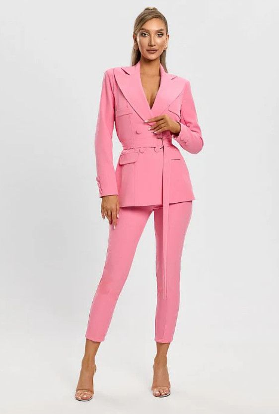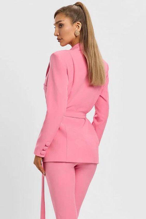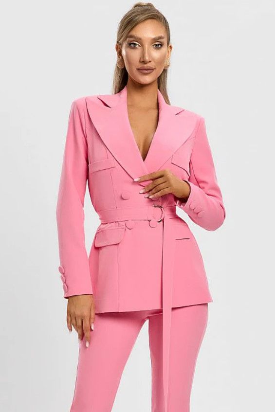 Raffinato ed elegante, questo blazer rosa doppiopetto e un must-have per ogni guardaroba chic. Il taglio strutturato con ampi rever, tasche decorative e bottoni tono su tono dona un tocco di classe e professionalit�. La cintura iv vita valorizza la silhouette, rendendolo ideale per outfit da ufficcio o per occasioni speciali.Indossalo con pantaloni coordinati per un completo sofisticato o abbinalo a jeans per un look piu casual ma sempre impeccabile.