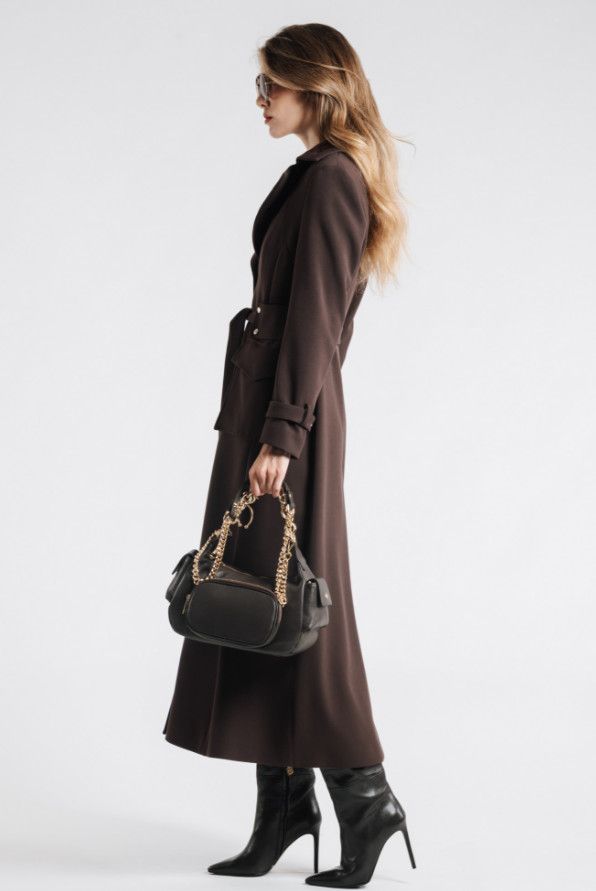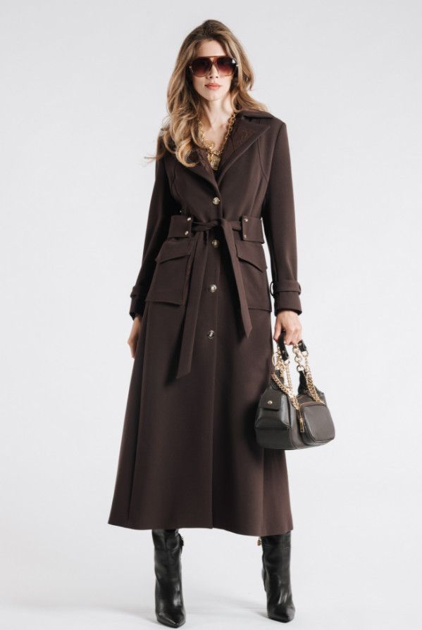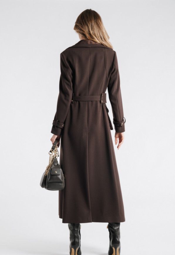 Poliestere 65% Viscosa 31% Elastan 3% MADE IN ITALY Cappotto lungo in tessuto strutturato dal taglio elegante e femminile. Presenta una chiusura frontale cob bottoni dorati, tasche applicate con pattina e cintura in vita per valorizzare la silhouette. Il colore cioccolato, caldo e sofisticato, lo rende perfetto per la stagione autunnale e invernale. Un capo versatile da indossare sia con look casual chic che con outfit piu eleganti.