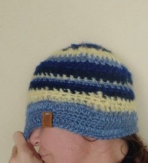 Berretto handmade all'uncinetto con utilizzo di 100% lana mohair vintage perfettamente conservata dagli anni '80. Righe blu e gialle per questa berretta casual. La testa calda è assicurata con questo cappello in lana. Unisex. Vestibilità abbastanza comoda 56/57. Raccomandato lavaggio a mano in acqua fredda con detergente per lana o delicati. No asciugatrice.