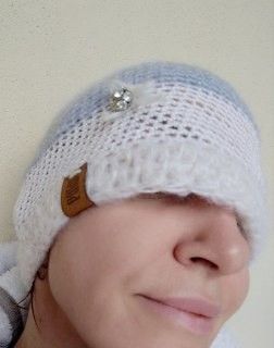 Berretto handmade all'uncinetto con utilizzo di 100% lana kid mohair, angora e mohair vintage in gomitoli anni '80 perfettamente conservati. Il bianco si alterna all'azzurrino e al grigino in bande più o meno regolari. L'inserto dello speciale bottone in cristallo swarovski del 1949, preso da un abito di mia nonna Angela impreziosisce questo cappello in lana. Il pon-pon è in 100% lana bouclè. Cuffia leggerissima e caldissima. Donna Vestibilità comoda 57/58. Raccomandato lavaggio a mano in acqua fredda con detergente per lana o delicati. No asciugatrice.