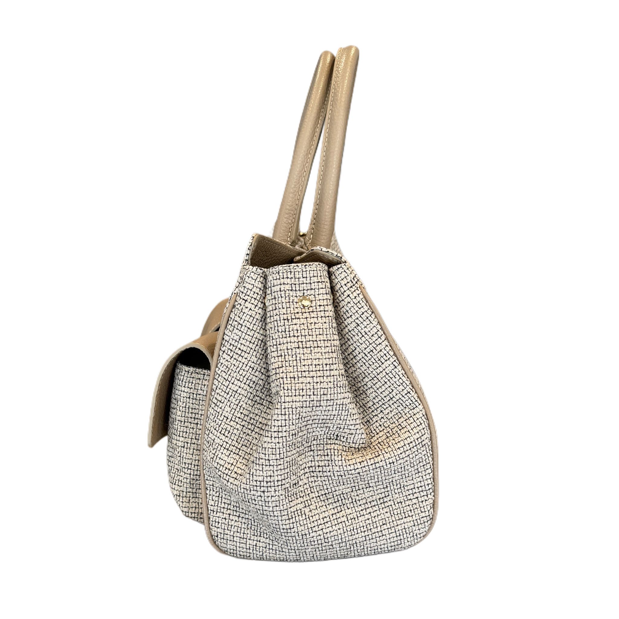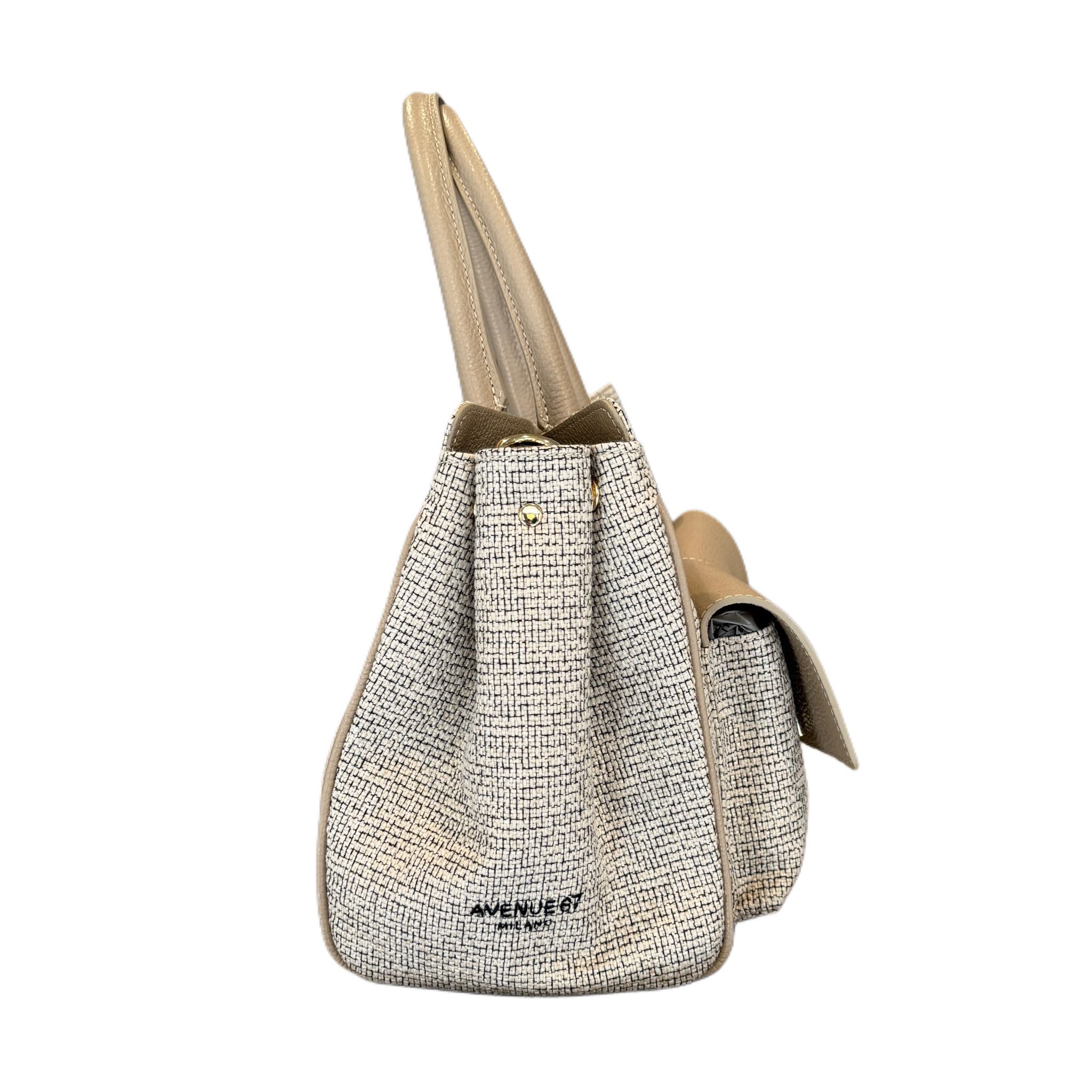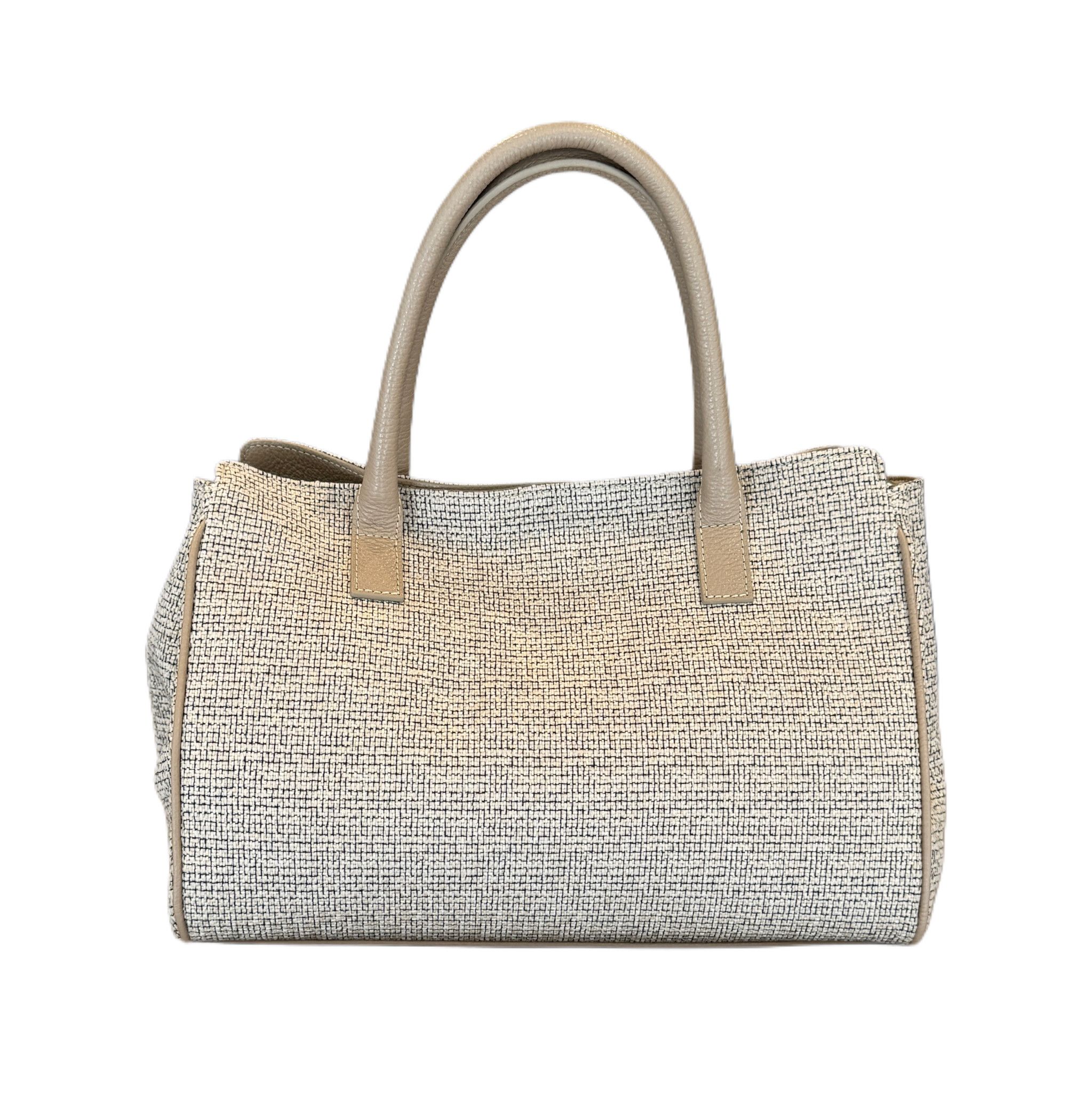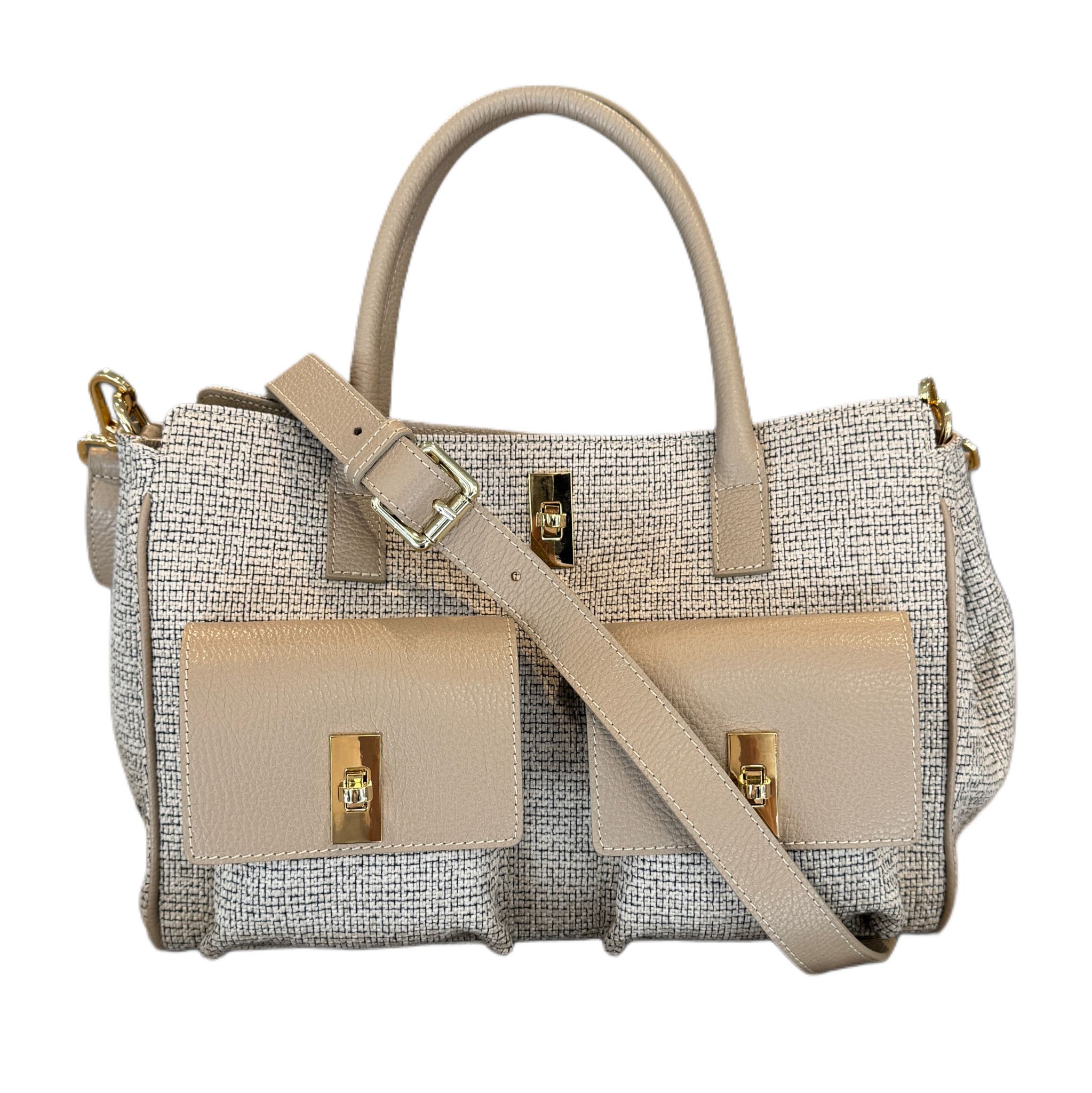 SOLEDAD XS WOOL Descrizione: borsa morbida, doppio manico, chiusura a girello, unico vano centrale, tasca interna con zip, doppia tasca portaoggetti, doppie tasche esterne con patella e chiusura a girello logo ricamato, tracolla rimovibile e regolabile max cm 130. Pelle: TESSUTO/PELLE SIZE cm L.34 H.23 P.12