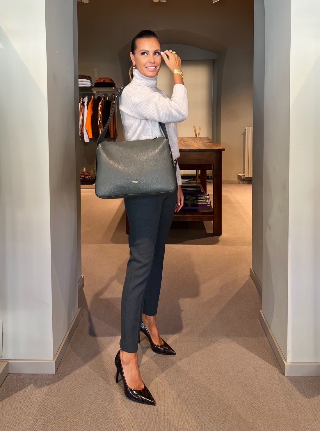 ESSENTIAL Descrizione: borsa morbida con manico fisso regolabile, chiusura con cerniera, tasche laterali con chiusura girello, unico vano centrale, tasca interna con zip, doppia tasca portaoggetti. Pelle: DOLLARO SIZE cm L.35 H.26 P.12