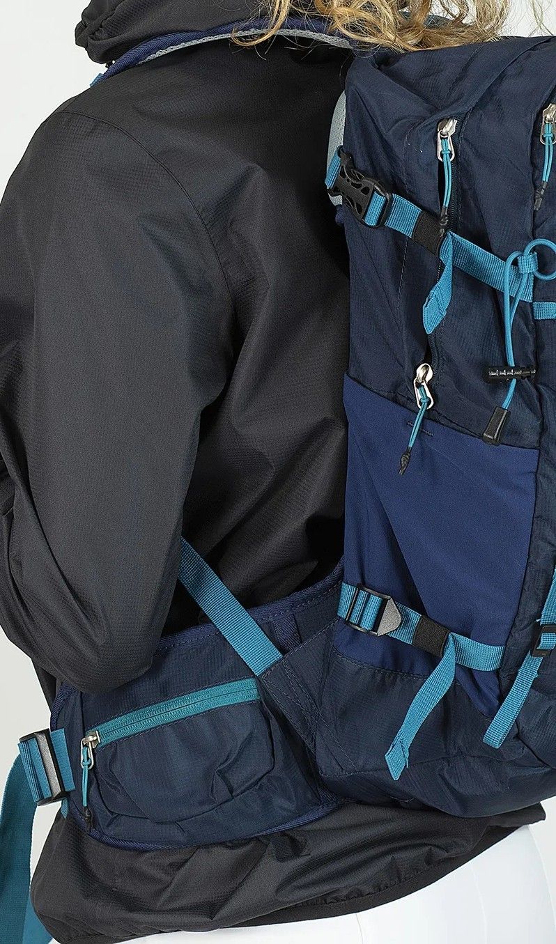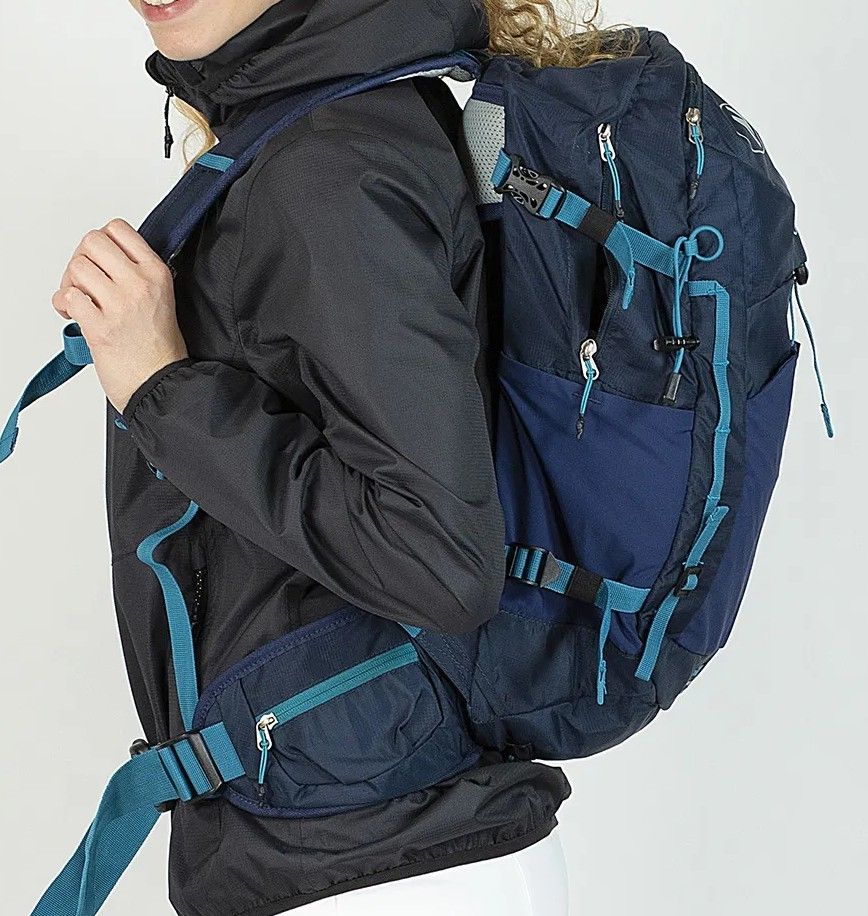 Zaino capacita' di 32 litri. carico dall'alto con ampio e capiente vano con tasca interna. due tasche frontali. tasche laterali in rete. fibbie di compressione laterali. punti d'ancoraggio multifunzionali regolabili. schienale con ventilazione staccabile. spallacci imbottiti e regolabili, cinturino lombare con le tasche.