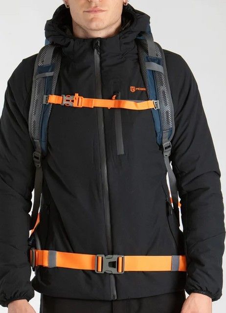 Tache laterali in rete, tasca frontale con cerniera, scomparto fondo zaino con cerniere con soffietto rischiudibile per separare la zona dal resto dello zaino, porta picche o bastoncini, cinghie portamateriale ai lati e sul ondozaino, tascone con cerniere sulla cima dello zaino, spallacci regolabili con fischgietto di emergenza, schienale in rete, fasche lombari con cerniere portaoggetti.