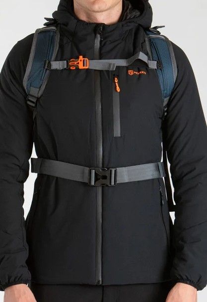 ZAINO 22 LT due tasconi con zip a doppio cursore, un terzo tascone più picolo con zip sempre a doppio cursore, doppio porta picozze o bastoncini, due tasche laterali ai lati, portamateriale ai lati, portachivi all'interno, tasche a soffietto nei due scomparti piu grandi, spallacci regolabili, fascia ventrale bassa, fischietto emergenza